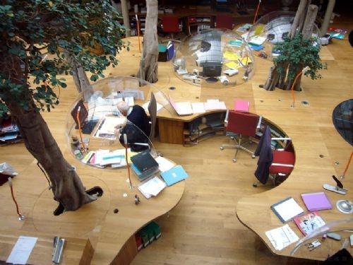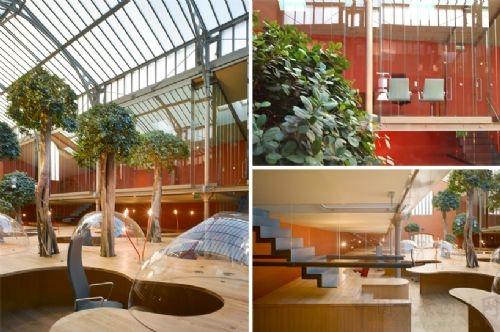法國建筑事務所christianpottgiesserarchitecturespossibles(christianpottgiesser,pascalethomaspottgiesser)為巴黎的兩家公司pons和huot,設計了一個辦公空間。這個設計的最大特點是有一個巨大的木質水平臺面,它既是天花板也是桌面,設計師用一種全新的方式來詮釋傳統辦公場所,用完全不同的景觀類型來塑造企業環境。