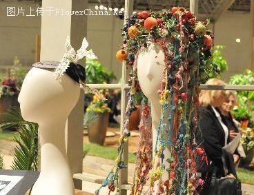 這是3月7日在芝加哥花卉園藝展上拍攝的布藝花帽?!?/p>