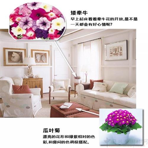 這間客廳采用了以白色為主色調(diào)現(xiàn)代風(fēng)格布置,所以在布置花卉的時候就要注意選擇色彩上不過分濃烈的花朵與客廳功能區(qū)的整體色彩感受相匹配。比如在這套布置之中,因為房間色彩的關(guān)系,所以可以在靠窗的邊桌放一組矮牽牛的花卉,雖然它的色彩并不和室內(nèi)空間完全一致,但近似的色系依然和客廳的整體感覺十分統(tǒng)一。就更不用說綠葉紫花的瓜葉菊了,客廳里兩處花草的點綴,讓人不禁有一種畫龍點睛的感覺。
