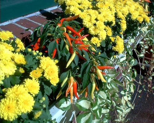在這個案例中,黃色部分由菊花構成,紅色和橙色的是觀賞辣椒。
