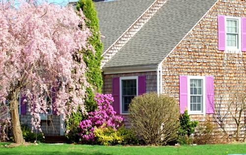 與上一個例子有所不同,這個例子中的植物色彩訴求的功能并非是要掩飾什么,而是在不影響視線的情況下利用植物的色彩搭配來突出墻面上的兩個彩色百葉窗。通過這種整體提升的色彩搭配法,使得房屋與周邊的植被甚至自然環境和諧地融合在一起,大大有效地提高了生活環境的空間效應。