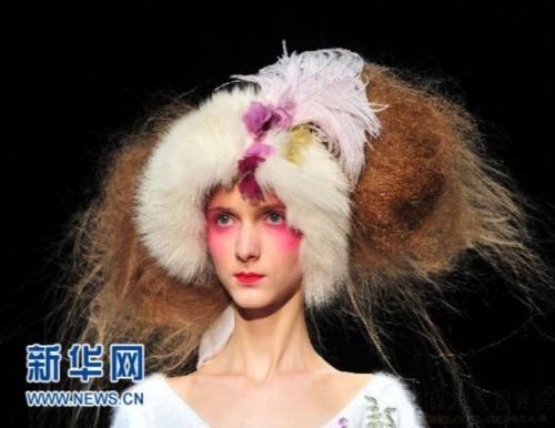在2011年西班牙馬德里秋冬時裝周上,西班牙時尚設計師埃莉薩·帕洛米諾推出的作品以夸張的發(fā)型設計與花卉裝飾成為一大亮點。 新華社記者陳海通攝