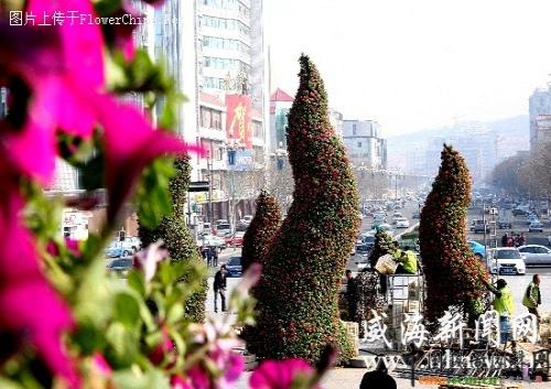 為迎接“五一”黃金周八方游客,連日來,市區園林部門用50萬盆各種鮮花裝飾各公園和廣場,使美麗的濱城更加亮麗多彩。圖為4月24日園林工人正在人民廣場搭建火焰造型的花卉景觀。