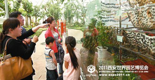 圖為游客在世園會自然館觀看蝴蝶孵化過程。