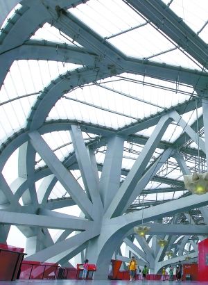 ▲國家體育場“鳥巢”頂棚每一塊膜結構都安裝有雨水回收管并構成獨立的雨水回收單元。本報記者 饒強攝