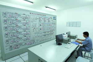在國家體育場“鳥巢”的雨水處理車間,工人通過雨洪利用系統調配各儲水池的水量。