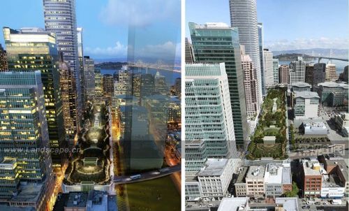 PWP事務所和環(huán)境藝術家Ned Kahn在項目中有所合作,設計了一個365米余長的公共汽車噴射噴泉,表現(xiàn)了公共汽車駛進站臺時飛濺的水花這個意向。流經(jīng)公園的雨洪和地下建筑的水將會被收集起來。在公園東部,一個地下的濕地將會凈化中水,然后用于地下的其他部分。在地上部分,PWP和多個機構合作,為Transbay的四個核心街區(qū)提供城市設計,包括Mission廣場。一個Tim Hawkinson設計的紀念碑將會矗立在廣場上。