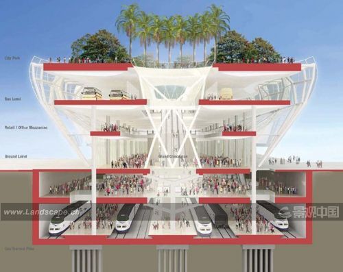 項目場地位于未來的公共汽車、輕軌和軌道終點站之上,設計中結合了水體改造、城市棲息地的可持續(xù)性原則。這個4英畝的公共公園將會為市民提供休閑娛樂和教育的體驗,同時會提高環(huán)境質量。