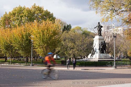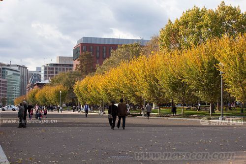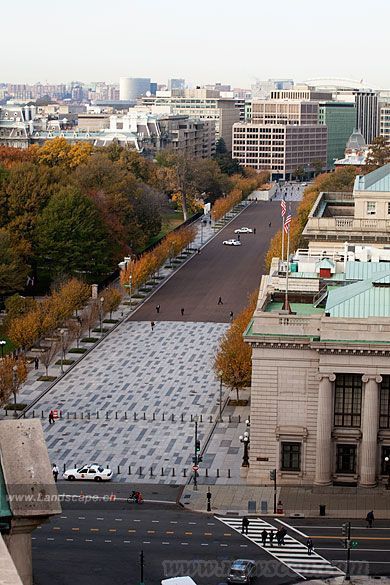 賓州大道與15、17大街相交,起始段的灌木叢與財政部和老新政辦公樓前的景觀相鄰。這些空間為必要的安全檢查站提供了位置,讓人在賓州大道處觀看到的白宮立面更加豐富,并為游人提供了有陰涼的就坐區(qū)域。賓州大道上一長列抗病的榆樹,將拉斐特公園和白宮場地連接起來,并加強了白宮作為總統(tǒng)花園的核心地位。具有華盛頓州傳統(tǒng)的街燈、石椅和不引人注目的護柱經(jīng)過簡單的組合強調(diào)了賓州大道作為公共場所的悠久歷史。設計中保持了街道中心作為開放空間,不阻礙人們觀看白宮的視線,并保存了這個場地作為民主空間、就職儀式的焦點和華盛頓日常使用道路的悠久傳統(tǒng)。