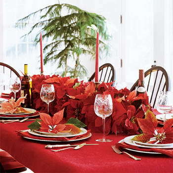 火紅的圣誕花串在一起做成餐桌的中心裝飾,絕對(duì)能讓節(jié)日的熱烈指數(shù)大增!將裝水的淺盤(pán)襯在圣誕花的枝葉下可延長(zhǎng)花期,注意不要將四周露出來(lái)。