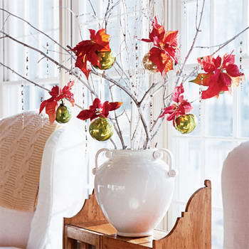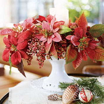一品紅雖然是很大眾的花朵,但搭配不俗的花器,就能展現(xiàn)出優(yōu)雅的格調(diào)。任何器皿都可以插花,酒 杯、瓷質(zhì)果盤(pán)、甚至奢侈些的銀質(zhì)容器都是很好的選擇。把這個(gè)簡(jiǎn)單的花藝擺放在茶幾、壁爐或窗臺(tái)上,都能增加溫馨的感受。