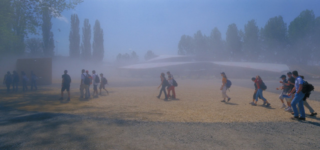 納沙泰爾湖(Neuchâtel)上的云中漫步項目:湖面的上空設置了漂浮的人造云,這朵所謂的"云(cloud)"很遠就可以看見,此設施通過在湖中設置一個金屬框架的建筑物,安裝大量的標準鋼質噴嘴,將經過過濾的湖水噴射成無以計數細微水珠,使之可以懸浮于空氣之中,形成人工云霧,達到"模糊(blur)"的霧化效果。云霧的形狀不斷奇妙地變化,在夜晚,就仿佛是一個從"X檔案"中出來的外星飛船,停泊于湖畔,游人一旦進入訪問區便會消失在白霧之中,營造出一種神秘曼妙的氛圍。