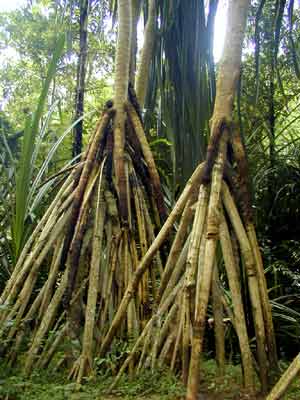 還好,自然界因“怕”說不清而在西雙版納留下了數十種植物作為活見證,露兜樹就是其中很有說服力的一種。古地中海消失后,它“認為”西雙版納這塊土地好而沒有跟它的家族一起遷移到有海的地方去,經過長期的磨練、演化,成為了后來發育起來的熱帶雨林的成員,并逐步適應了熱帶雨林酸性的土壤、潮濕而較陰暗的林內環境,而且還改變了非海邊不能生長的習性。然而,也許是“江山易改而習性難移”的某些遺傳基因還在起作用吧,它在樹干的下部還要長出很多氣生根并發展成為支柱根,保持它原來生長在海濱灘涂上為了“呼吸”和支撐地上植株的習性。