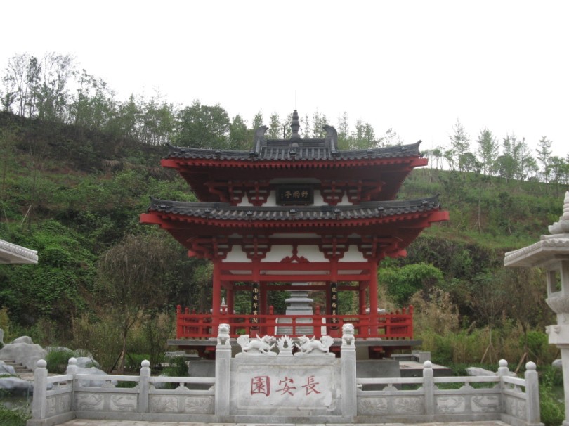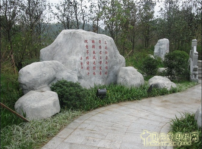 3、長安園入口處于中軸線上,并設置親水平臺,中心設置圓形地景。石質欄桿護岸,桿柱之間有銘壁,鐫刻"長安園"。自然式園路把各景點串接起來,臨水架橋,遇坡修臺,見石繞行,達到自然流暢。在園路兩側布置景石、石刻,高低錯落,疏密有致,自然成趣。