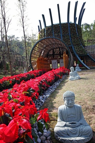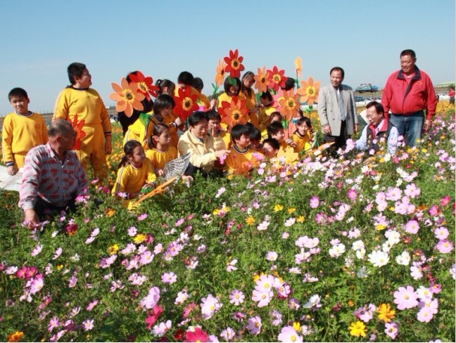 彰化園到處都是各色鮮花,即使建筑的頂棚,也是用鮮花鋪就的。"彰化的一大特色就是花卉。特別是在田尾,有成片的花田,路邊也是放滿了鮮花。"彰化縣政府城市暨觀光發(fā)展處處長(zhǎng)田飛鵬介紹,彰化園還融入了彰化縣的環(huán)境、地理、產(chǎn)業(yè)等地方元素,最大限度地還原當(dāng)?shù)鼐坝^特色。