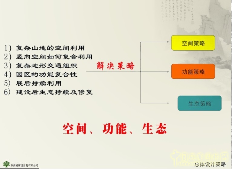 蘇州園的總體造園宗旨是要打造富有傳統風,古典風的典型蘇州園林。總體設計考慮空間策略、功能策略、生態策略三個方面,具體實施為復雜山地的空間利用、豎向空間復合利用、復雜地形交通組織、園區的功能復合性、展后持續利用、建設后生態持續及修復,體現出因地制宜、因勢成景的設計思想。
