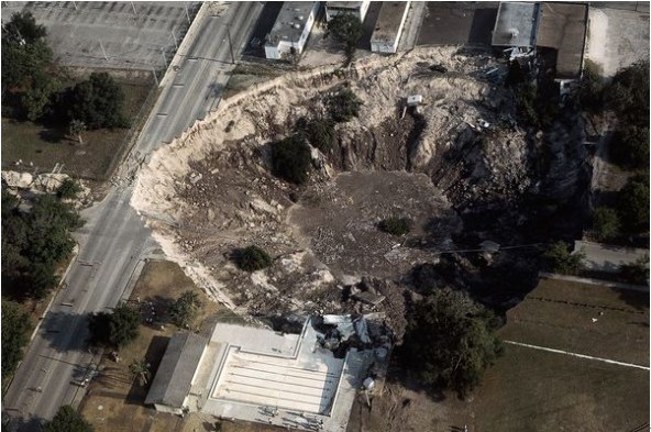 這個(gè)深約185英尺(約合56米)的天坑于1994年出現(xiàn)在佛羅里達(dá)州的馬爾伯里市,發(fā)生塌陷的地方位于采礦企業(yè)IMC-Agrico傾倒的一堆廢料。該公司當(dāng)時(shí)正在開采巖石以提取磷酸鹽。磷酸鹽是一種化學(xué)物質(zhì),是化肥的主要成分,主要用于制造磷酸,以及增強(qiáng)蘇打和各種食品的味道。然而,在磷酸鹽從巖石中提取出來以后,主要成分是石膏的廢料被作為泥漿過濾出來。
