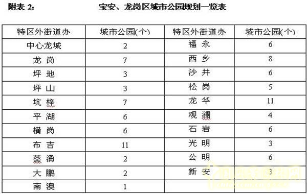 3.結合全面推進城市化要求,特區外規劃新建城市公園108個,其中寶安區58個、龍崗區50個(詳見附表2),通過大幅增加特區外公共綠地的建設投入,實現特區外城市建設水平和人居環境明顯改善。