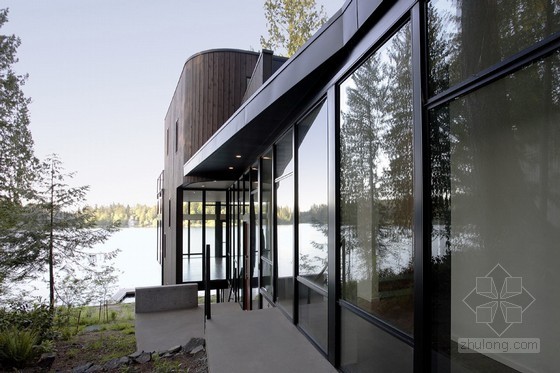 設(shè)計(jì)方案是創(chuàng)造一個(gè)通向水邊的道路,然后沿著道路布置住宅。道路開始于一個(gè)帶有附屬車庫和辦公室的汽車停車空間,然后它向下經(jīng)過臥室區(qū),沿邊的冷杉一直延續(xù)到斜坡中部,這里有一個(gè)玻璃入口,它將室內(nèi)室外融合。從這里開始起居空間向著室外景色打開,形成懸臂結(jié)構(gòu),它的玻璃立面最大限度地爭取湖面景色和自然光的吸收。這些與湖相關(guān)的部分都是由木板覆蓋的墻壁包圍,它為住戶提供隱私和美好的視野。從入口往下,住宅漸漸過渡到道路上,這里有一個(gè)帶頂?shù)拈T廊,繼而是一個(gè)結(jié)實(shí)封閉的庭院,最后才是慢慢接近的湖水濕地。