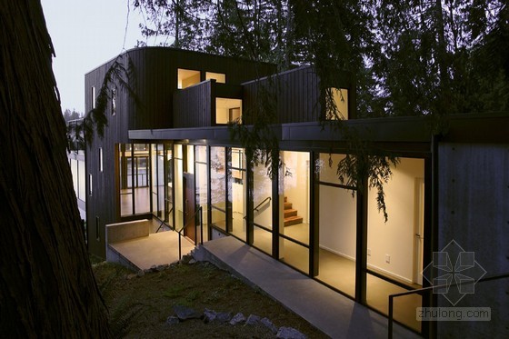這是一塊小巧狹窄的場地,它順著陡峭的斜坡延伸,一直到美麗的山中溪水。巨大的冷杉樹占據(jù)西側(cè)場地,東半部分是一個(gè)之前被大火燒毀的木屋。設(shè)計(jì)師的挑戰(zhàn)是為一對年輕有創(chuàng)意的夫婦在這里設(shè)計(jì)一個(gè)住宅,它即要保護(hù)樹木和周圍的自然景觀同時(shí)還要延伸住宅的視野,拉近住宅和湖面的關(guān)系。
