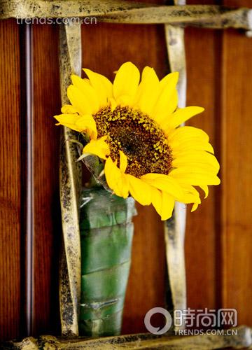 9單枝的葵花效果一點也不差,當然,這更要歸功于包裹著它的巴西鐵花器。這是非常典型的“紅花還需綠葉配”,雖然直白,但是真理。