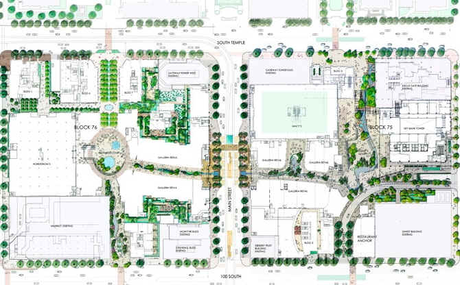 購物中心有一條長一公里的人造溪流,沿著步行為主導(dǎo)的綠色空間蜿蜒成"S"形,讓人回想起1847年鹽湖城成立的歷史。由SWA集團設(shè)計的這個項目也是美國最大的流動水體項目,建造有三座瀑布和一座50英尺高的噴泉。其中最大的瀑布Regent Court瀑布有17英尺高,每分鐘要2500加侖的水流,瀑布下的巨石有14噸,是從附近買來的。
