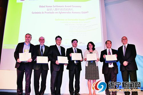 左起:法國南特市、美國洛杉磯縣、中國新加坡天津生態城、中國貴州都勻市、巴西庫里提巴市、中國四川遂寧市獲得“全球綠色城市”殊榮,右一:聯合國環境署可持續消費與生產部部長阿拉布·霍巴拉先生