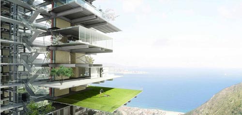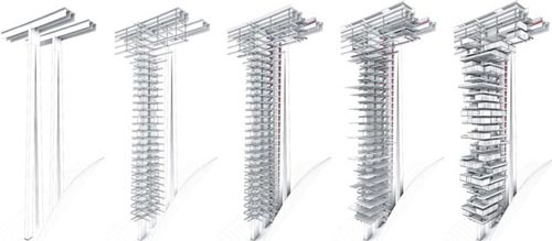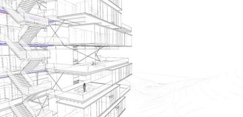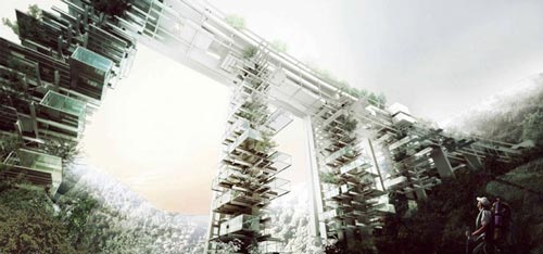 順著結構支柱,在新舊建筑類型之間建立了一個和諧的結合體?;诠δ苌系目紤],其中一座高架橋的上部將設置一個人行散步道,而其它的路徑將作為車行專用道。一系列公共和私人的環境景觀配合著預先設計的水景,圍繞著整個建筑體旋轉,試圖將人造物與周邊茂盛的自然景觀結合一體。