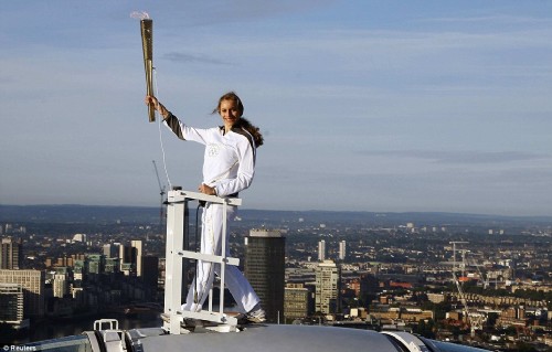 7月22日,英國探險家、倫敦奧運會火炬手戴維·亨普勒曼-亞當斯在“倫敦眼”上展示奧運火炬。當日,倫敦奧運會火炬傳遞繼續在倫敦進行。英國探險家戴維·亨普勒曼-亞當斯的女兒艾米莉亞玩了一把驚險游戲:爬出觀光倉,站在外面鳥瞰倫敦。現年17歲的艾米莉亞同樣是一個冒險者,去年她在父親的陪同下抵達南極點,成為史上最年輕的南極征服者。