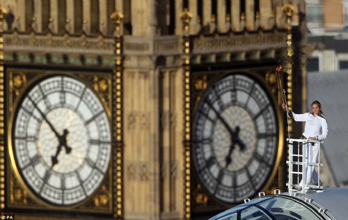 奧運(yùn)的腳步臨近:艾米莉亞站在經(jīng)過(guò)特殊處理的太空艙上,這一棒火炬?zhèn)鬟f也是倫敦火炬接力的一部分