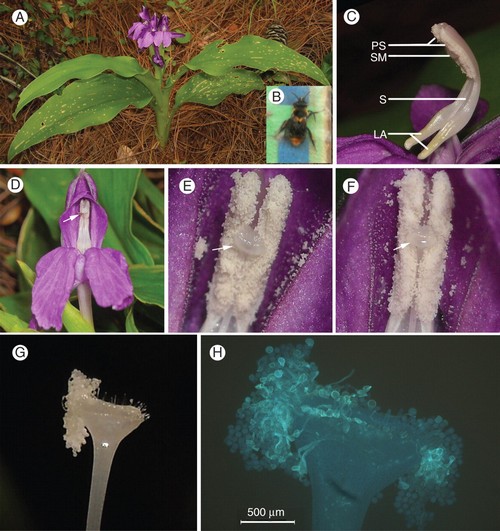 插圖:A:長柄象牙參的植株;B:在野外捕獲的訪花頻率極低的昆蟲;C:花內部結構(PS-花粉囊,SM-柱頭,S-花柱,LA-杠桿狀雄蕊附屬體);D:開花前去除了花粉囊的花,用來檢測傳粉者對種子產量的貢獻。E-F:自花傳粉的方式(E:花開第一天時的柱頭狀態(tài),箭頭指示柱頭上有少量萌發(fā)液;F:花開第三天時的柱頭狀態(tài),箭頭指示柱頭上的萌發(fā)液聚集成一個小液滴聳立于柱頭之上;G:花開第四天時的柱頭狀態(tài),柱頭粘住旁邊的花粉;H:花開第四天時的柱頭染色后在熒光顯微鏡下觀察的狀態(tài),花粉在柱頭外面萌發(fā),花粉管伸入柱頭)