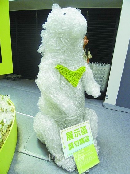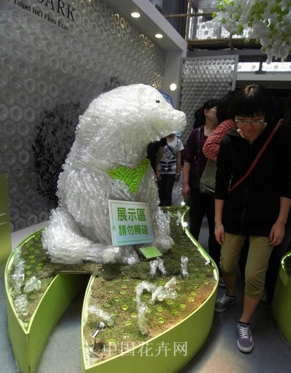 與傳統PET塑料瓶相比,植物瓶采用新技術制造而成,30%以上材料取自于植物,從而降低了對非再生資源的依賴性。為倡導環保理念,在臺灣花博會上,設計師用扭轉植物瓶的方式,制作了花樹以及憨態可掬的狗熊、熊貓等動物形象,以引導人們支持和消費環保產品,保護自然及自然界生長的植物和動物。