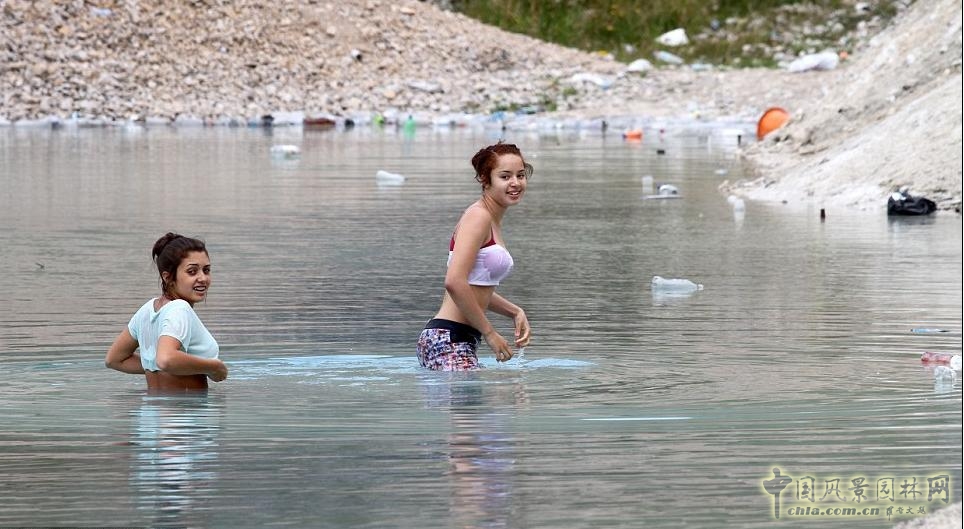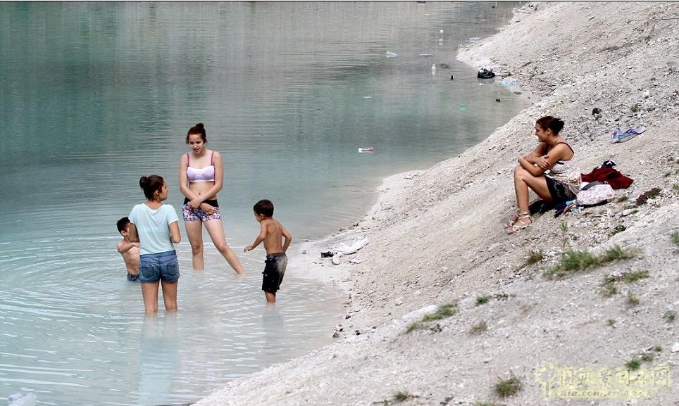 然而這兒并未阻止慕名前來的人們,上周末,有一家人從20英里外的斯托克波特來到這兒,忽視了那些前石灰石采礦場遺留的潛在危險,在湖水中嬉戲。兩個大約五、六歲的男孩在水中玩著舊塑料瓶和奶瓶用紙板,他們的媽媽在湖邊看護著,這位36歲的媽媽說,她看見了警示語,但是沒把它當回事兒。“我已經告訴孩子們不要喝這兒的水,不要往深處去。”她說,“太陽出來了,湖水是那么藍,那么美。”兩個在水中游水的女孩說,只要水的深度沒有達到脖子就好吧,這片湖水太迷人啦。