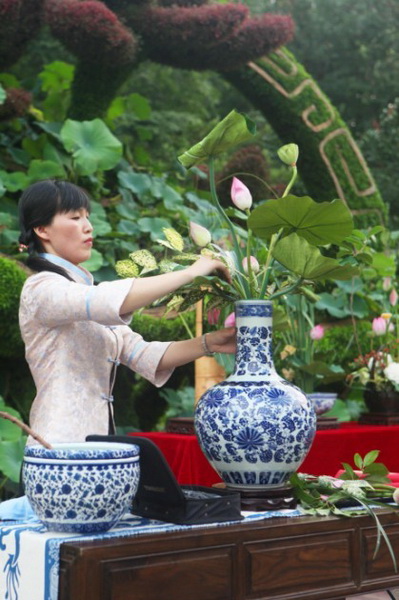 中國傳統插花源于唐代佛前供花,之后所演繹出的插花表演對工具、場所、養護水質、幾架形狀等都有嚴格規定,還要譜曲、詠詩謳歌,再飲美酒方能盡興。8月11、12日,上海插花花藝協會的專業藝術家們本著“古為今用、弘揚傳統”的理念,首次將靜態插花與動態藝術表演相結合,為市民游客重現了一場一千三百多年前唐代“九錫”式插花表演。花藝師在表演程式、服裝、音樂、手勢等方面既傳承古韻,又融入當代生活氣息,以荷花、蓮葉、蓮蓬為創作素材,以盤、瓶、碗、缸、籃、桶六大傳統容器作為花草生長的"房舍",創作出一件件精致、深邃、有生命、充滿意境的花卉藝術品,譜寫出一首首無言的詩,勾勒出一幅幅立體的畫。