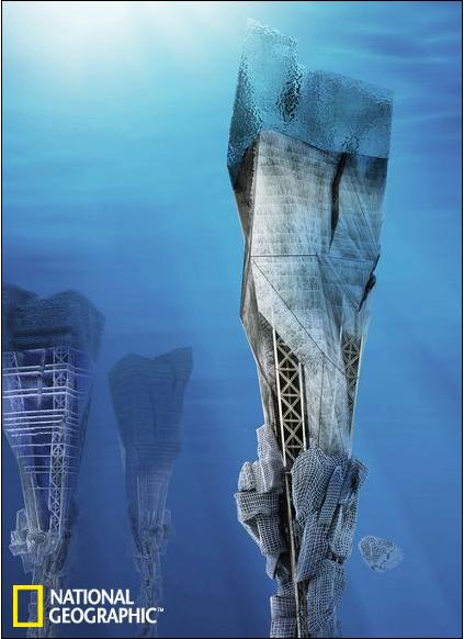 對于太平洋垃圾帶的另一種解決方案是反其道而行之,在水下建造“垃圾填埋場”,比如這款由一個塞爾維亞小組給出的“海洋高樓”(Oceanscraper)設計方案。這座塔的底部會被用來收集垃圾并送至其核心進行處理。這座海底塔形建筑的上方將可以支持建造具備自持能力的居住區。