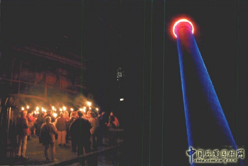 我沿著鐵樓梯爬上了曾經(jīng)的煉鋼高爐,來到70米高空的觀景平臺;又沿著高架的鐵隔柵空中步道穿過大量由污染還不能對公眾開放的儲存空間;和孩童們一起滑下穿過1米厚混凝土墻的不銹鋼管狀滑梯,興奮的感受到滑梯中光線明暗的變化所讓我感知到的墻體的厚度;沿著場地北面有雨水收集作用的河道進行時,驚喜的發(fā)現(xiàn)一個個藏在厚重墻體后的精致花園。我在北杜伊斯堡公園待了整整一天,因為我想看到其由著名藝術(shù)家設(shè)計的夜間燈光照明效果。意外的,我遇上公園內(nèi)組織的夜間火把游團隊。雖然我不能加入其中,但是看著這群人手舉火把,火光若隱若現(xiàn)的映照出復(fù)雜的工業(yè)管道與建筑,伴著另一處場地中電影節(jié)激烈的槍炮聲回響在工業(yè)廠房中的轟轟聲響,真讓人有一種又刺激又夢幻的全新感受。