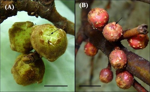 雞嗉子榕的二個變種雌果形態 (A) F. semicordata var. semicordata (FSS) and (B) F. semicordata var. montana (FSM)