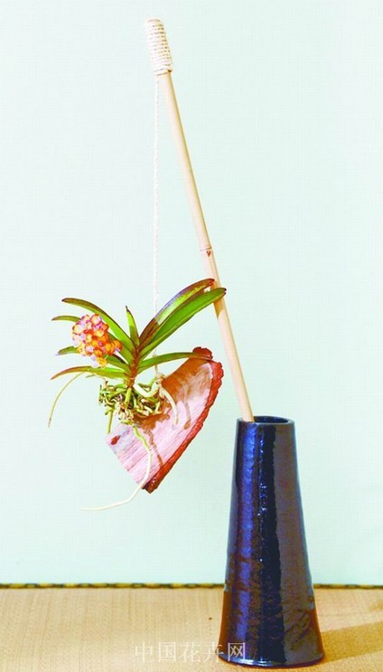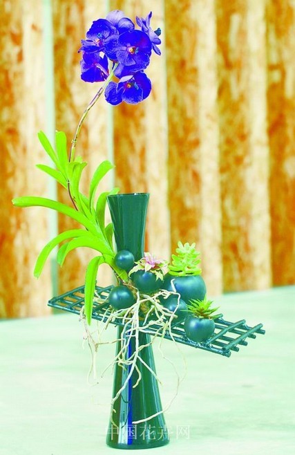 設計理念:從花器的形狀產生聯想,表現萬代蘭的花、葉、氣根,形成上、中、下段的不同特色,配合黑色花器,有一種別出心裁的時尚感。