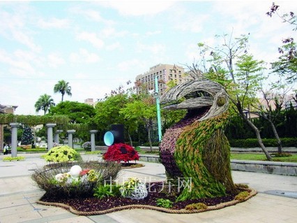 第一階段以盆栽設(shè)計(jì)為主,以盆栽做成活潑可愛的動物等造型,讓游人可以觀賞游玩其間。在精心鋪設(shè)的“草坪”上,以白色和紅色一品紅盆花做成的兩只“瓢蟲”栩栩如生,格外可愛;以云龍柳、山歸來、海棠、鳳梨等制作的“仕女”造型姿態(tài)優(yōu)美,植物本身的顏色讓仕女的裙擺格外絢麗;“大嘴鳥”的頭部是白木枝條制作的,鳥身則為龍柏、絨葉鳳梨盆栽,翅膀?yàn)樵讫埩鎸χ札埩l編織的鳥巢,里面還有幾只:“恐龍蛋”,景觀散發(fā)著一種遠(yuǎn)古時代的氣息。另外,以“魔術(shù)方塊”和“俄羅斯方塊”為主題的盆栽造景也趣味盎然,色彩繽紛。這些盆栽造型多是以鐵藝做出雛形架構(gòu),再以大量的枝條和盆栽修飾外形,達(dá)到植物和造型和諧統(tǒng)一的效果。