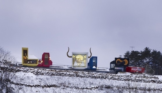 我們可以肯定的說這個短角旅館將會在人們中間產生巨大的爭議,要么非常喜歡,要么極度厭惡,而這恰恰就是建筑設計所Moon Hoon所希望看到的。這個旅館位于旌善郡的郊外,它包含六個演奏室,是提供給搖滾樂隊的吉他手使用的。有藝術色彩,好玩,郊外,這些元素都展現了這個建筑的藝術范兒的風格。對于韓國的都市市民來說大家都渴望能夠在退休后逃離千篇一律的城市生活,而體驗一種像歐洲鄉村風味的感覺。因此客戶便委托Moon Hoon設計所來設計這樣一個地方,也正是客戶的這樣的特殊的需求才會有我們看到的那個獨特的外觀。這里的每個房間都有各自的主題,包括韓式烤肉,油畫,甚至傳統的韓國屋子里的吊床,它們共同組成了一個動態的多樣的建筑風格。