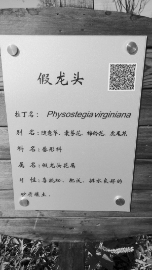 13日,來到百花園,里面的很多植物都是以前沒見過的,觀賞谷子、劍蘭、假龍頭、石竹等,在每個(gè)介紹牌子的右上角都有一個(gè)二維碼,記者拿出手機(jī)在上面掃了一下,手機(jī)上就出現(xiàn)了該植物的具體信息。記者連續(xù)掃了好幾個(gè)二維碼,都可以在手機(jī)上看到該植物的相關(guān)介紹。