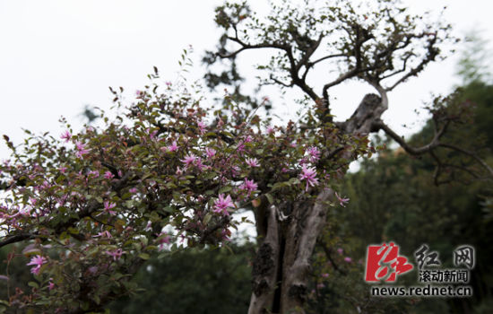 今天(10月16日),雖然天氣有些冷,長沙園林生態園仍不少反季節開放的花兒。在生態園的入口處,美人梅迎著風兒開花,粉色的花瓣,星星點點,點綴在枝葉上。紅花檵木也是滿樹的粉色落滿枝頭。桃樹一般都是先開花、后發葉、再結果。長沙園林生態園工作人員劉娟介紹,不過這一天,通常只在春天冒芽的幾棵桃樹也抽了新芽。
