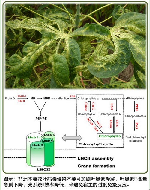 上海辰山植物園能源植物生物技術(shù)組研究人員利用高通量測序技術(shù)研究了受非洲木薯花葉病毒侵染木薯的全基因組水平轉(zhuǎn)錄響應(yīng),表明光合作用相關(guān)的通路所受影響最大,特別是葉綠素降解相關(guān)基因明顯上調(diào),而編碼捕光復(fù)合體II的主要天線蛋白基因表達(dá)下調(diào);結(jié)合受侵染葉片細(xì)胞中葉綠素a含量不受影響而葉綠素b含量急劇下降,并且基粒垛疊層數(shù)減少,表明植物細(xì)胞可通過調(diào)控葉綠素循環(huán)來維持葉綠素a的穩(wěn)定,并且減少光系統(tǒng)II的效率,降低病毒侵染對宿主細(xì)胞產(chǎn)生的影響。該研究不僅闡明了雙生病毒感病導(dǎo)致木薯葉片褪綠病癥產(chǎn)生的原因,而且表明病毒對光系統(tǒng)的非致死影響是其避免宿主劇烈免疫反應(yīng)的一種策略,是病原與宿主長期共進(jìn)化的結(jié)果。