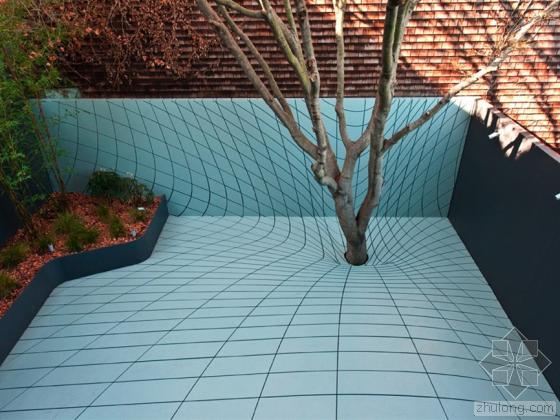 此次的設計作品名為”Deformscape”,座落在舊金山城市街區的一棟私人住宅。這座空間有限的室外雕塑花園中只有一棵書,設計師ThomasFaulders將其設計成引力模式下的作品,設計上使用三維思維創作,利用三維投影方式,造成2D平面上歪曲線網投影。這個作品就是在平面上通過線的走向趨勢給我們在三維上造成一種下陷的錯覺。