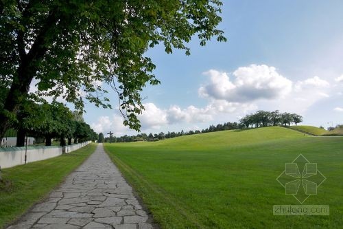這塊位于斯德哥爾摩的公墓是由兩位年輕的建筑師──阿斯普隆德和萊韋倫茨設計,建于1917-1920年。他們用砂礫鋪地,地上種滿了松樹。這里的設計把植物、建筑特色及地形的不規則性相結合,使景觀與墓地功能相融合。它對世界上許多國家的墓地設計都產生了深刻影響。