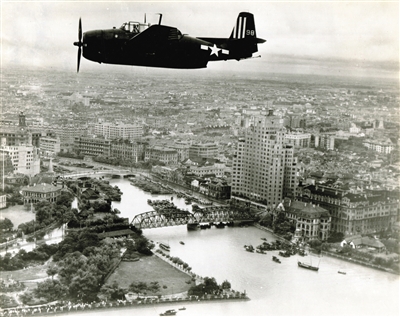 黃浦江上空,照片自東向西拍攝。蘇州河口的建筑清晰可見,外白渡橋北側的百老匯大廈上還看得到“興亞”的字樣,這是上海淪陷后日軍強行更改的名字。乍浦路橋和外白渡橋間的碼頭上停著很多中式帆船;照片左側可見外灘公園、新天安堂、郵政總局和新亞大酒店的尖塔;遠處的虹口區還沒有太多高樓,如今則大不一樣了。