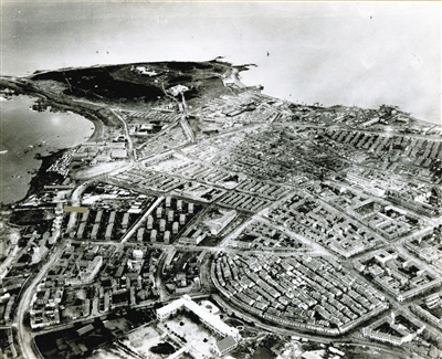 大約是蘭山路上空自東北向西南拍攝的老西鎮一帶。最遠處是團島,貴州路、西康路、南陽路、單縣路和汶水路劃分的街區整齊有序,輪廓隨海岸線而變化。遠處的團島在1914年日據時期即被辟為水上飛機場和電臺,是“閑人免進”的軍事基地,因此沒有太多房子。
