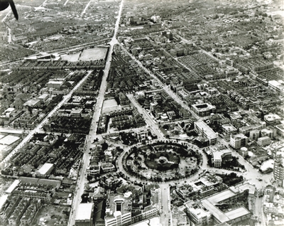 今天津中心文化廣場一帶,自東北向西南拍攝。舊時天津法租界遼寧路、丹東路和承德道圍起來的區域有座圓形花園,被稱為法國花園,租界收回后改稱中心花園,近年改建后又稱中心文化廣場。法國規劃師似乎很喜歡斜向的道路,并在道路的交匯處設立公共空間,如花園、雕塑等。照片左上角的空地是耀華中學的操場。