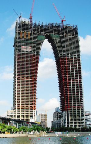 據報道,蘇州地標建筑、被戲稱為“秋褲樓”、高301米的蘇州東方之門十年仍未完工,業主擔心其會成為“爛尾樓”。