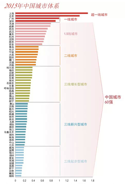 據報道,昨天,一份叫做《中國城市60強》的報告在互聯網上廣泛傳播,網友們熱烈討論:自家所在的城市究竟排名如何?這份由國際知名房地產及投資管理服務機構仲量聯行對外發布。在這家機構眼中,2015年中國城市體系分為超一線城市、一線城市、1.5線城市、二線城市、三線增長型城、三線新興城市、三線起步型城市,而“中國城市60強”的榜單中,并不包括中國最發達的“北上廣深”。